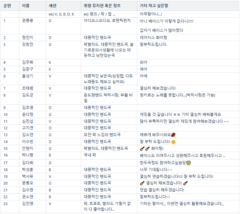 합주 연습을 시작하기에 앞서, 멤버들의 희망 세션과 합주 신청곡 리스트를 받았습니다. 인원이 많아서 일부 세션으로 몰리지 않을까 걱정도 되었지만, 키보드 외에는 다행스럽게도 원하는 세션으로 고르게 나눠졌습니다.