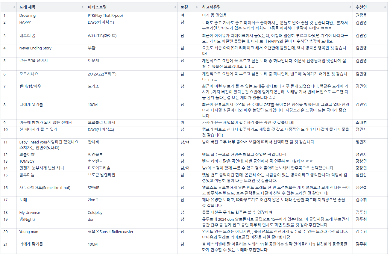 세션 신청과 마찬가지로 올해는 멤버들의 의견을 적극 반영하여 공연 곡들을 리스트업 했습니다. 잔잔한 곡부터 락 스피릿이 물씬 느껴지는 곡들까지 신청곡 리스트가 너무 많아서 어떤 곡을 선정할지 고민이 많았지만, 2025년을 마무리하는 시기이니만큼 분위기 있는 곡들을 섞어 공연 곡을 확정했습니다.