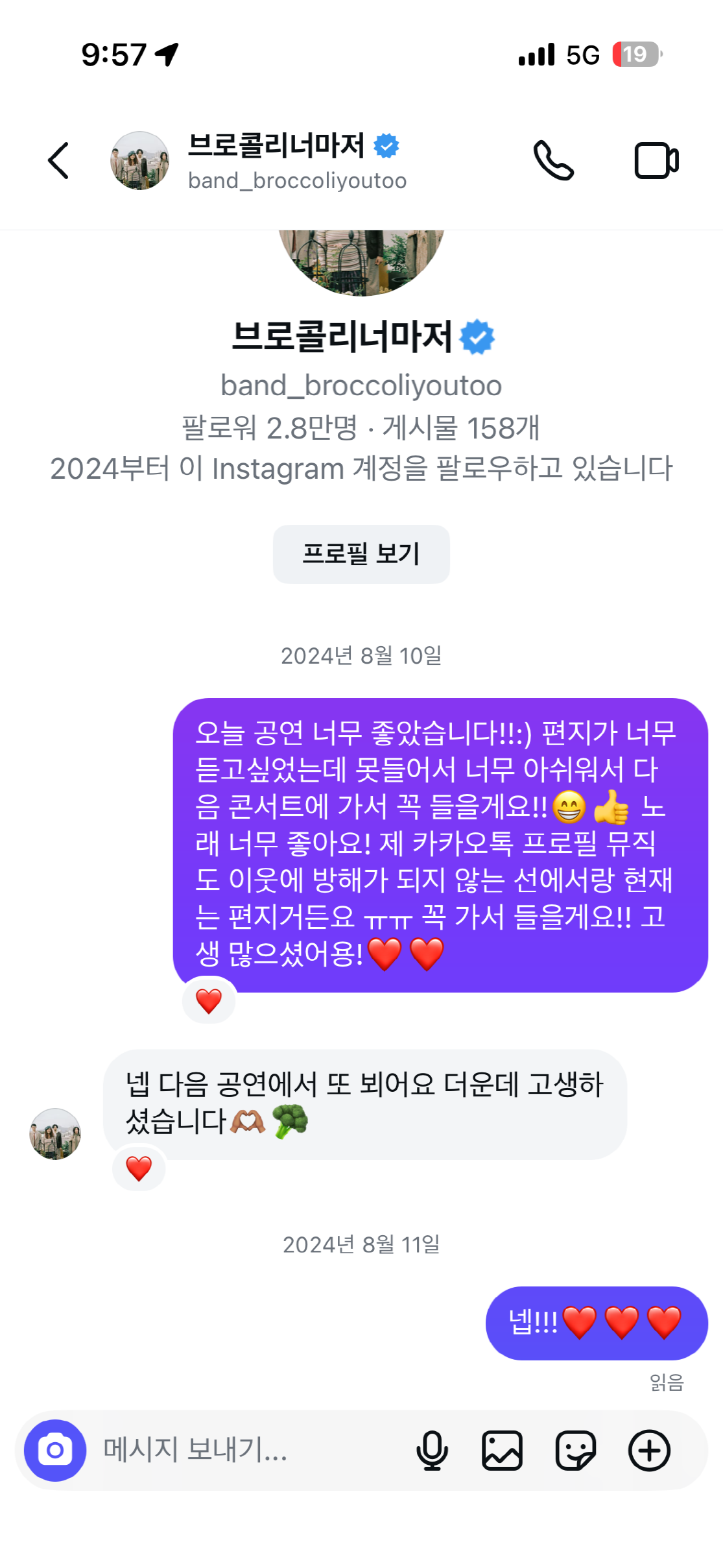 이처럼 제가 공연에서 부를 만큼 좋아하던 밴드가 노들섬 야외 무대에서 공연하는 모습을 보기도 하고 DM을 주고받기도 하며 성덕이 되기도 했습니다.