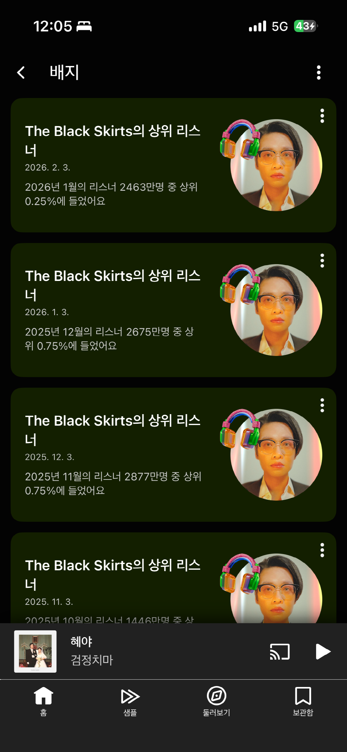 제 밴드의 끝사랑은 아마도 검정치마가 될 것 같아요. 몇 달 동안 수없이 들었지만 지금 들어도 모든 곡이 여전히 새롭게 들립니다!(저는 지난해 6월부터 항상 상위 리스너에 위치해 있답니다. ㅎㅎ)