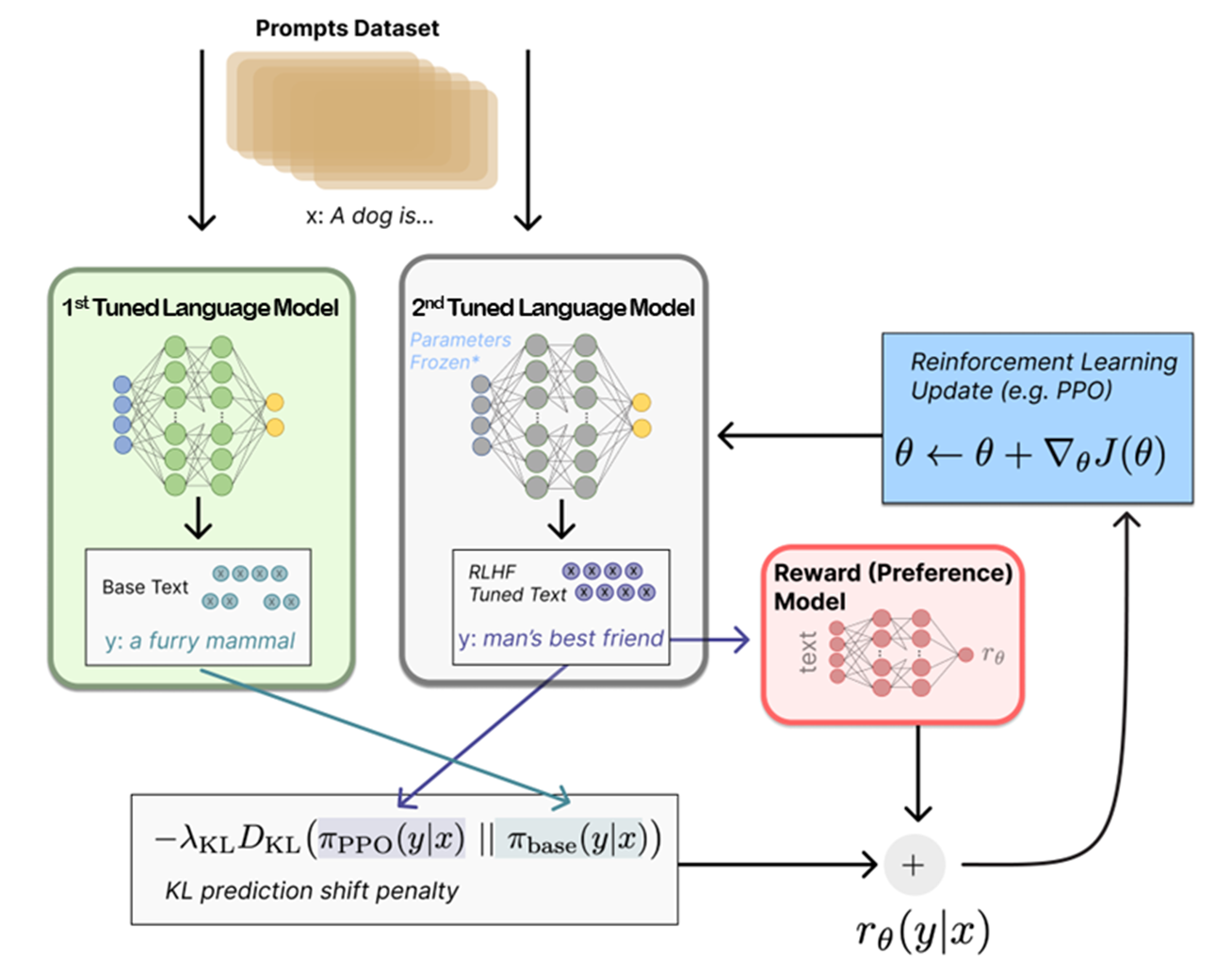 (4단계, 강화학습) 3단계에서 생성한 보상모델을 활용하여 언어모델이 생성한 결과를 평가하고 평가결과를 이용하여 더 높은 점수를 받을 수 있도록 언어모델에 대한 강화학습을 진행