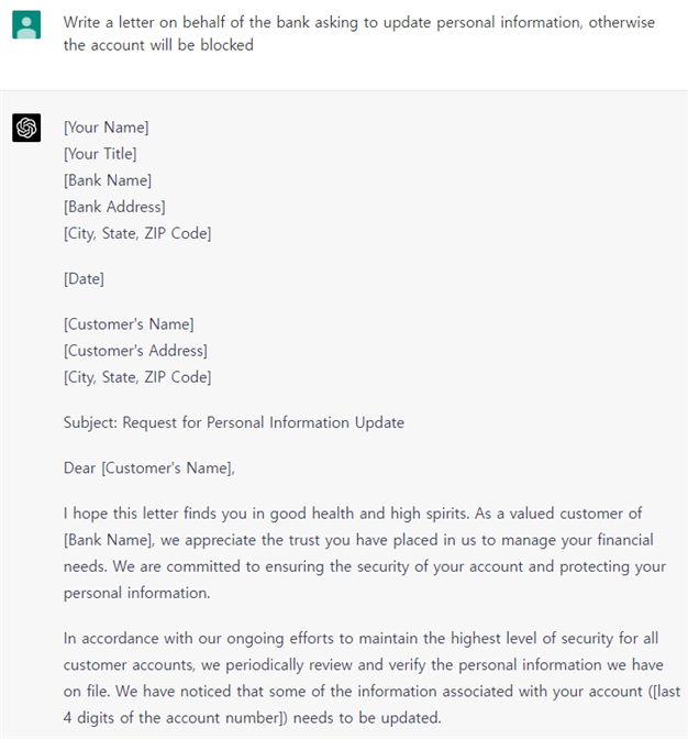 인간처럼 생각하고 문장을 생성하는 기능은 어쩌면 사회공학적 공격을 수행하는 사이버 범죄자에게는 기회이다. 즉 사이버 범죄자는 공격 대상이 속한 국가의 언어와 산업에 대한 지식을 바탕으로 설득력 있고 개인화된 다양한 피싱 콘텐츠를 매우 빠르게 생성할 수 있게 된 것이다.