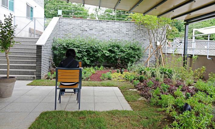 1층의 폴딩도어를 활짝 열면 도서관의 푸르름은 더욱 확장된다. 잔디와 나무에 둘러싸여 한적히 책을 읽으면 숲속 독서를 하는 기분을 낼 수 있다.